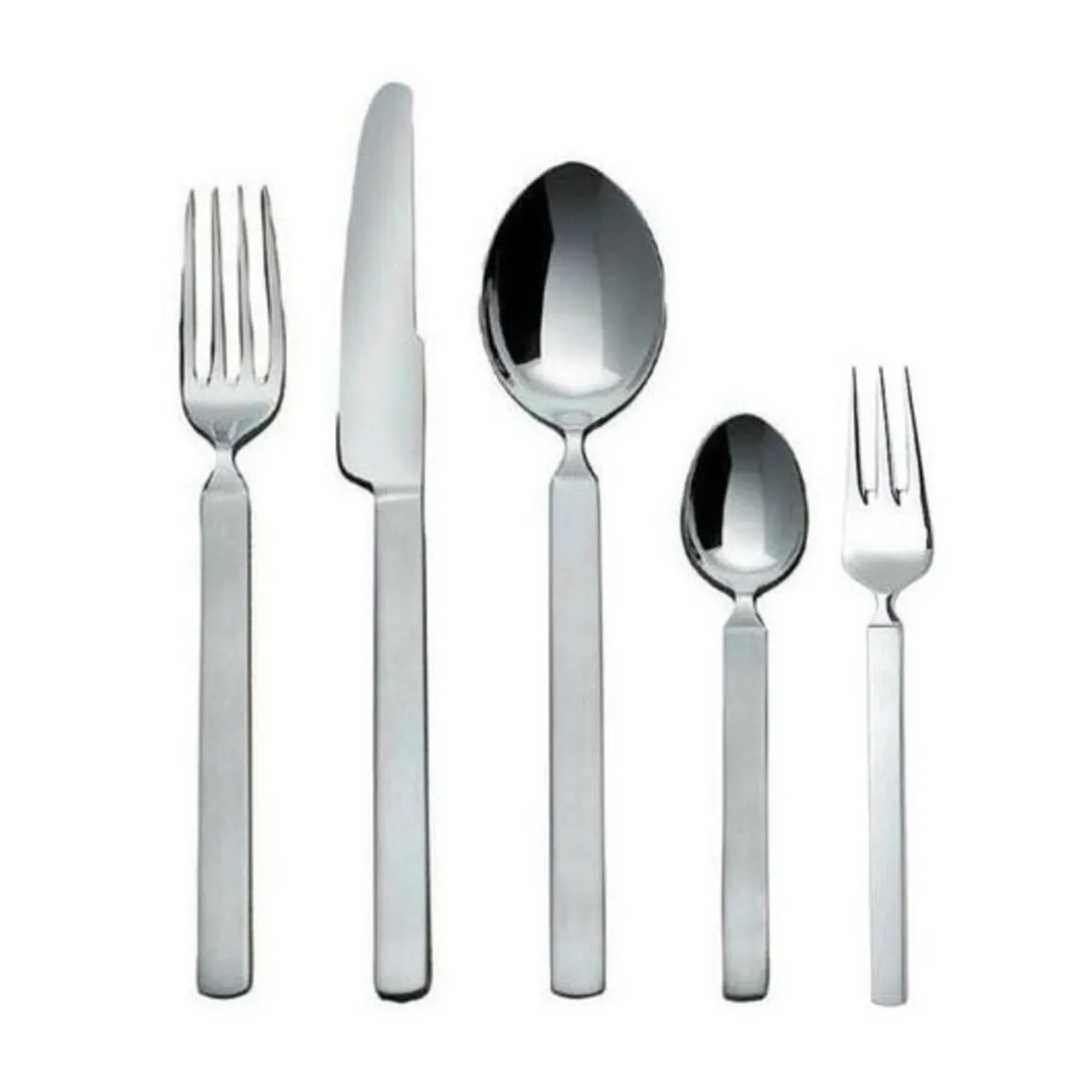 Die kantig moderne Form der Besteckgarnitur Dry von wird durch die raffinierte Kombination aus polierter und matter Oberfläche hervorgehoben. Der Entwurf des italienischen Designers Achille Castiglioni betont den glänzenden Teil durch die matt polierten Griffe der Messer, Gabeln und Löffel. Das macht das Besteck so interessant und besonders, welches bereits seit 1982 zum festen Sortiment im Hause Alessi gehört.