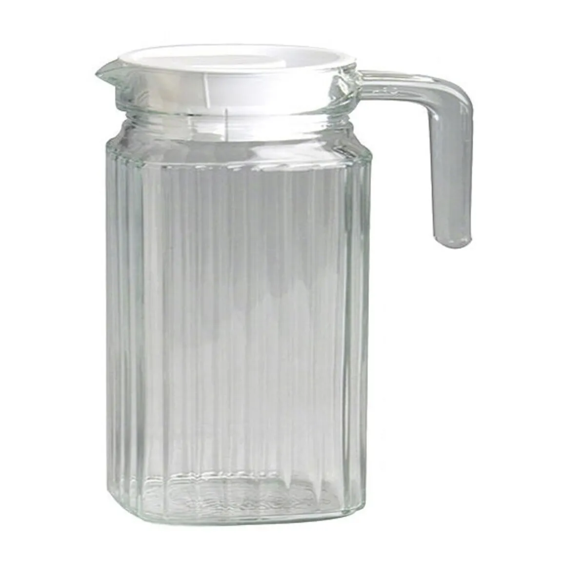 Sogar die Jüngsten können mit dem Krug Quadro ihre Getränke ohne Hilfe einschenken. Der breite Griff liegt sicher in der Hand und selbst im gefüllten Zustand ist er nicht zu schwer. Er ist ganz aus Glas und hat ein längs gestreiftes Rillenmuster, womit er zu jedem vorhandenen Geschirr passt. Seine quadratische Form wird durch eine Rundung am Hals unterbrochen. Ein Deckel aus weißem Kunststoff verhindert, dass Insekten ins Getränk gelangen. Der Krug Quadro lässt sich in der Spülmaschine reinigen.