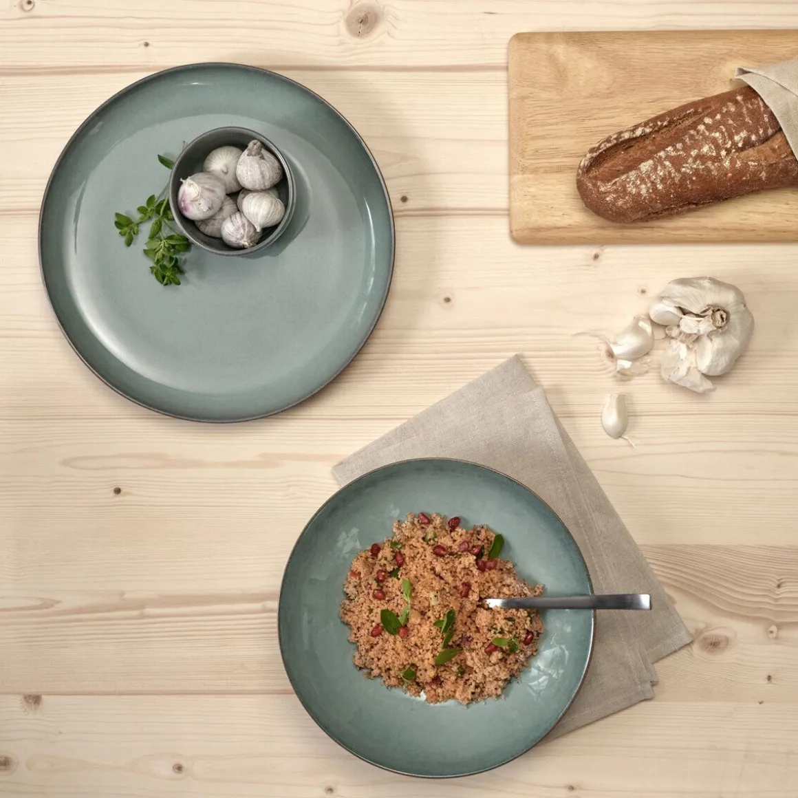 Ob Fisch, Fleisch, Gemüse oder Pasta – auf dem Essteller Saisons Eucalyptus der Marke lässt sich jedes Gericht ansehnlich servieren. Durch eine spezielle Effektglasur entsteht beim Brennvorgang ein bezauberndes Farbspiel mit tollen Schattierungen. Somit wird jedes Teil der Serie zu einem einzigartigen Unikat.