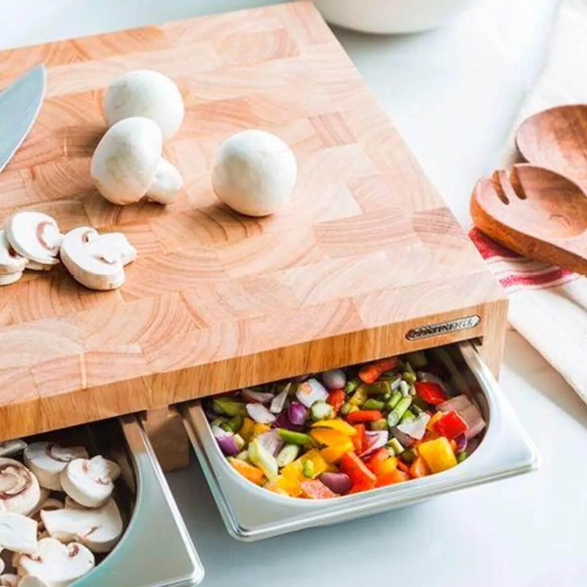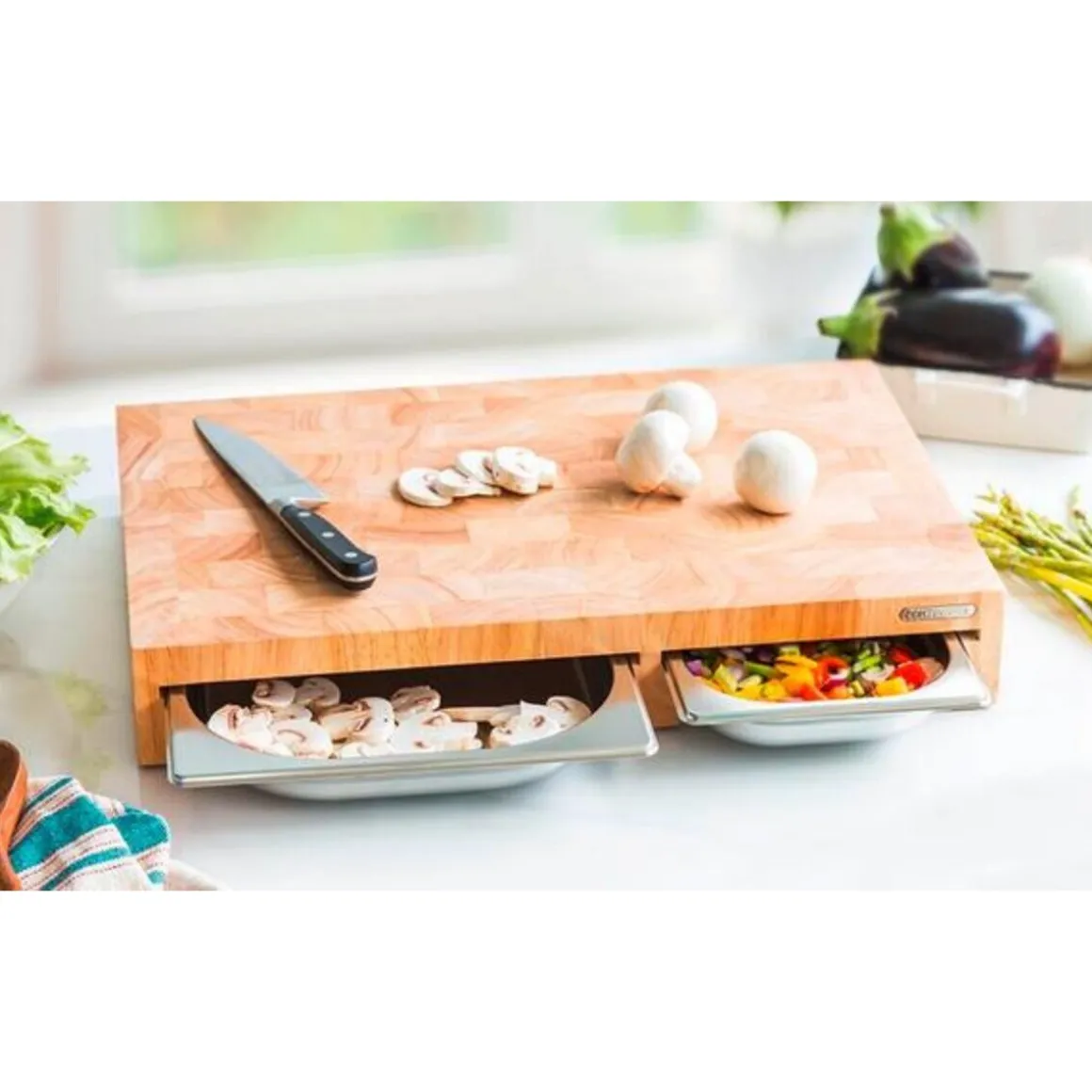 Dieses clevere Multifunktionsbrett Gummibaum-Stirnholz von ist hochwertig konzipiert und auf die Schonung Ihrer Messer ausgelegt.