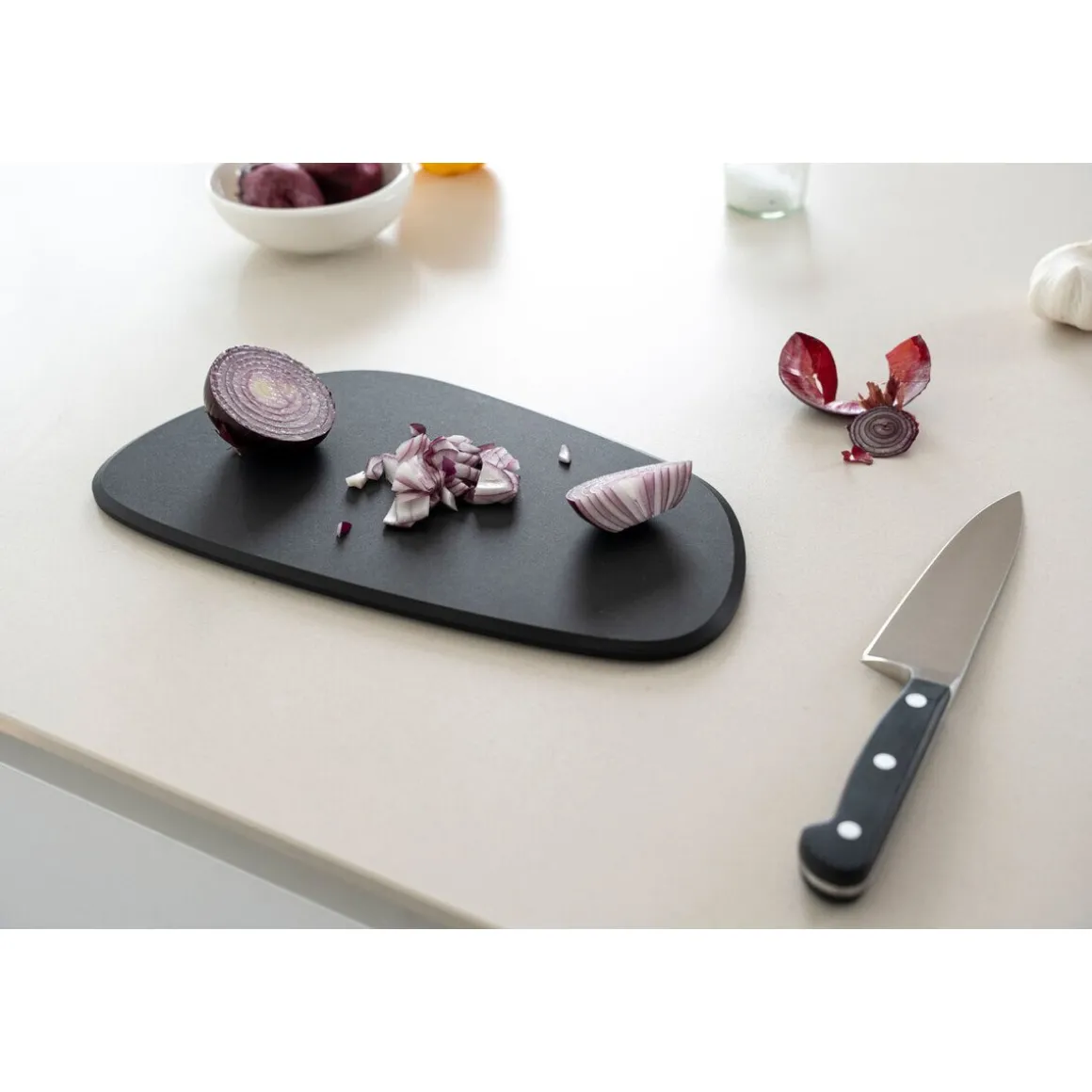 Das funktionale Schneidebrett Duracore von ist in seiner Formsprache an die Linien eines Kieselsteines angelehnt. Durch diesen modernen Look und die Fertigung aus äußerst belastbarer Holz-Papier-Faser überzeugt die Konzeption als zuverlässiger, langlebiger Alltagshelfer.