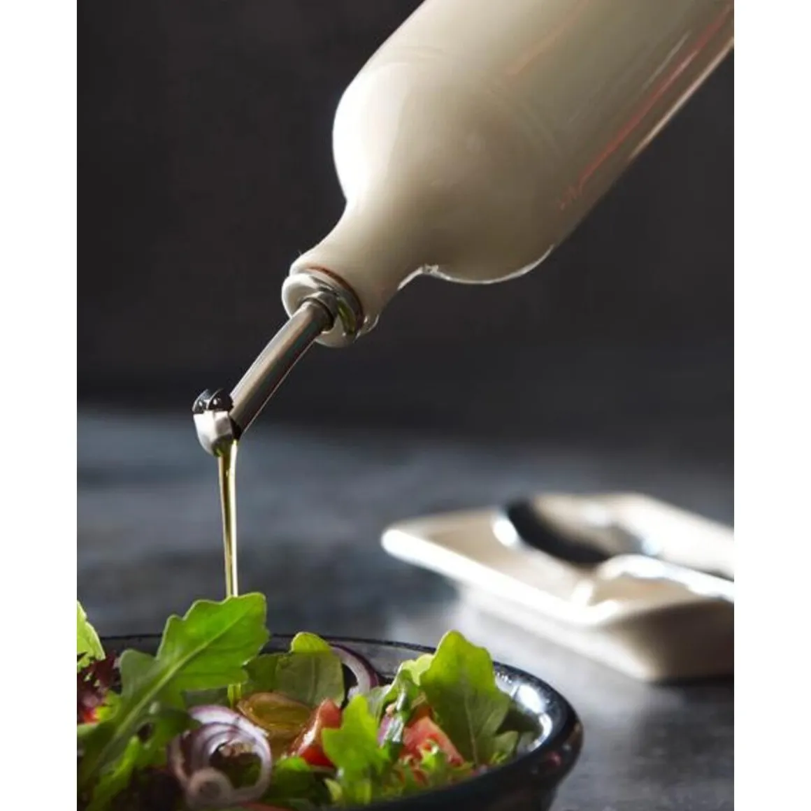 Der helle Ölgießer Argile von besticht durch seine dezente Farbgebung und den wohlgeformten Ausgießer, der das zielgerichtete Dosieren von Öl ermöglicht. Als Solokünstler oder im Ensemble mit anderen Fläschchen, überzeugt die Konzeption aus Keramik gleichermaßen.