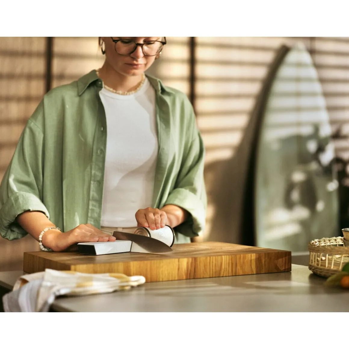 Mit dem Rollschleifer Horl 3 Cruise von verleihen Sie Ihren Messern auf nachhaltige Art eine neue Schärfe. Die feine Sand-Optik passt zum ozeangebundenen Kunststoff, aus dem der Rollschleifer gefertigt ist und versprüht einen natürlichen Hauch. Ob Küchen- oder Taschenmesser, ob stabile oder feine Klinge – mit dem Horl 3 schleifen Sie mit Blockdiamanten auf sichere Art. Einfach das Messer an die Schleiflehre anlegen und im gewünschten Winkel fixieren, dann den Rollschleifer mit sanftem Druck zuerst mit der Diamantscheibe über das Messer ziehen und Material abtragen, anschließend mit der Abziehscheibe das Ergebnis verfeinern.