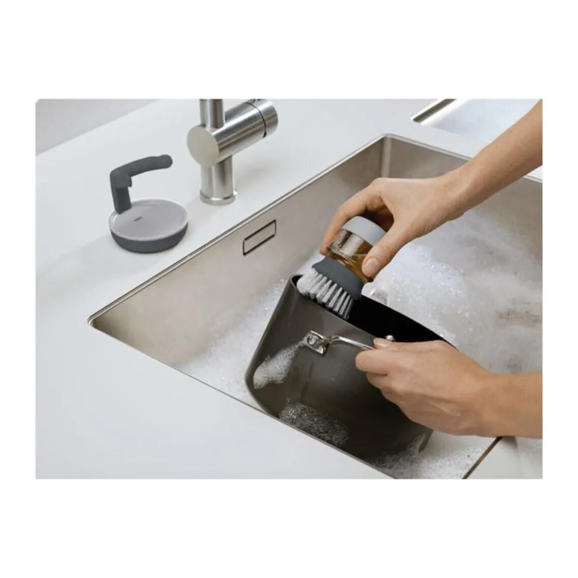 Mit der smarten Abwaschbürste Palm Scrub von haben Sie ein kompaktes und hilfreiches Utensil zur Hand, mit dem Sie nicht nur Schrubben, sondern zugleich auch Spülmittel hinzufügen können. Die Spülbürste hat einen integrierten Behälter, der auf Druck für Schaum im Spülbecken sorgt.
