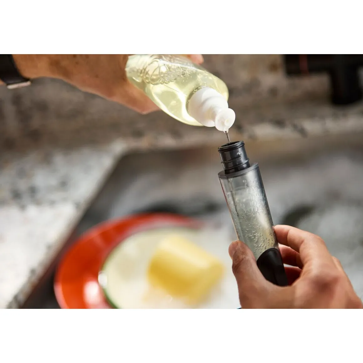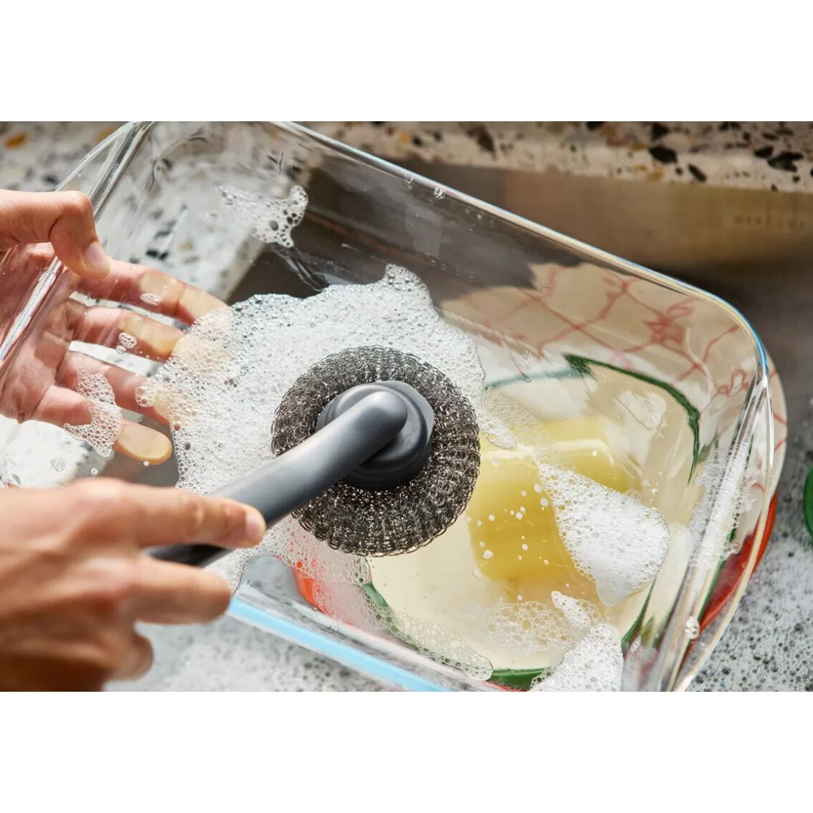 - der gut zu führende Griff lässt sich mit Spülmittel befüllen und gibt dieses während des Abwaschens an das Geschirr ab