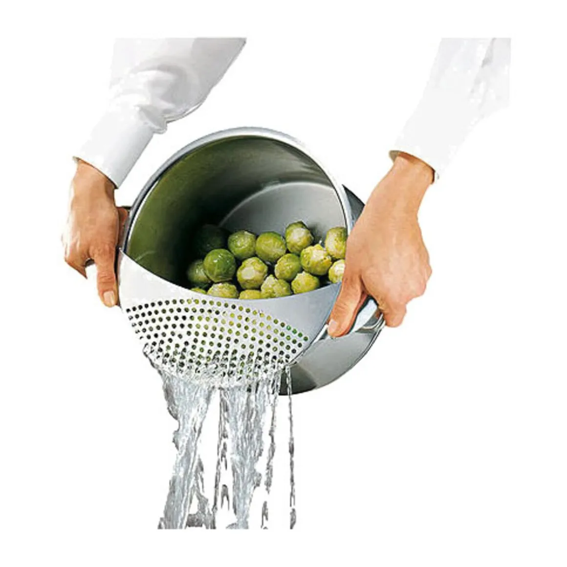 Zum Abgießen von kochendem Wasser legen Sie das Sieb einfach auf den jeweiligen Topf und halten es an den beiden Griffen fest. Das Abgießsieb mit einer Breite von 33,5 cm ist für Töpfe mit einem Durchmesser bis 24 cm konzipiert und benötigt aufgrund seiner geringen Höhe weniger Platz im Schrank als herkömmliche Siebe und Seiher. Es besteht aus rostfreiem Edelstahl und lässt sich in der Spülmaschine reinigen.