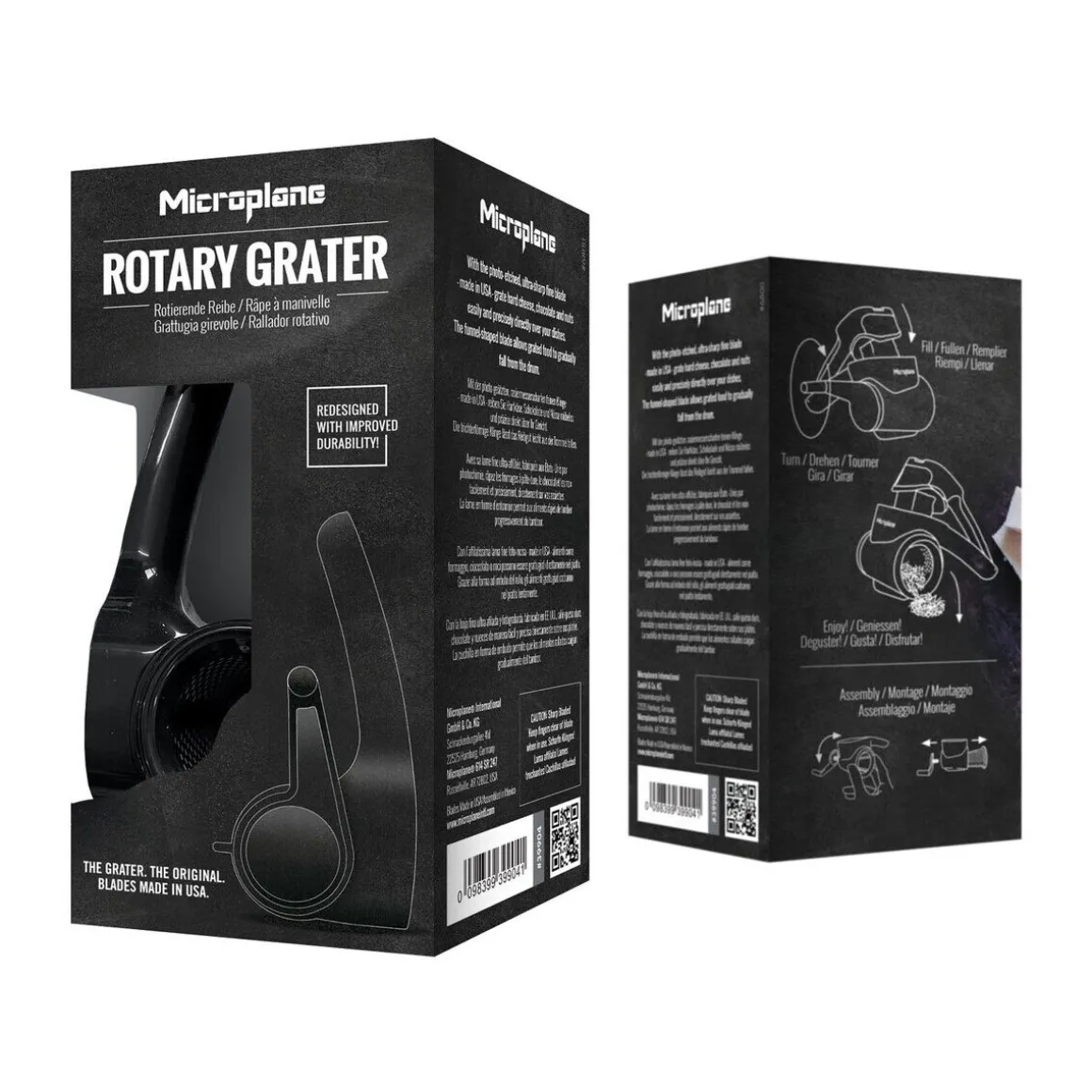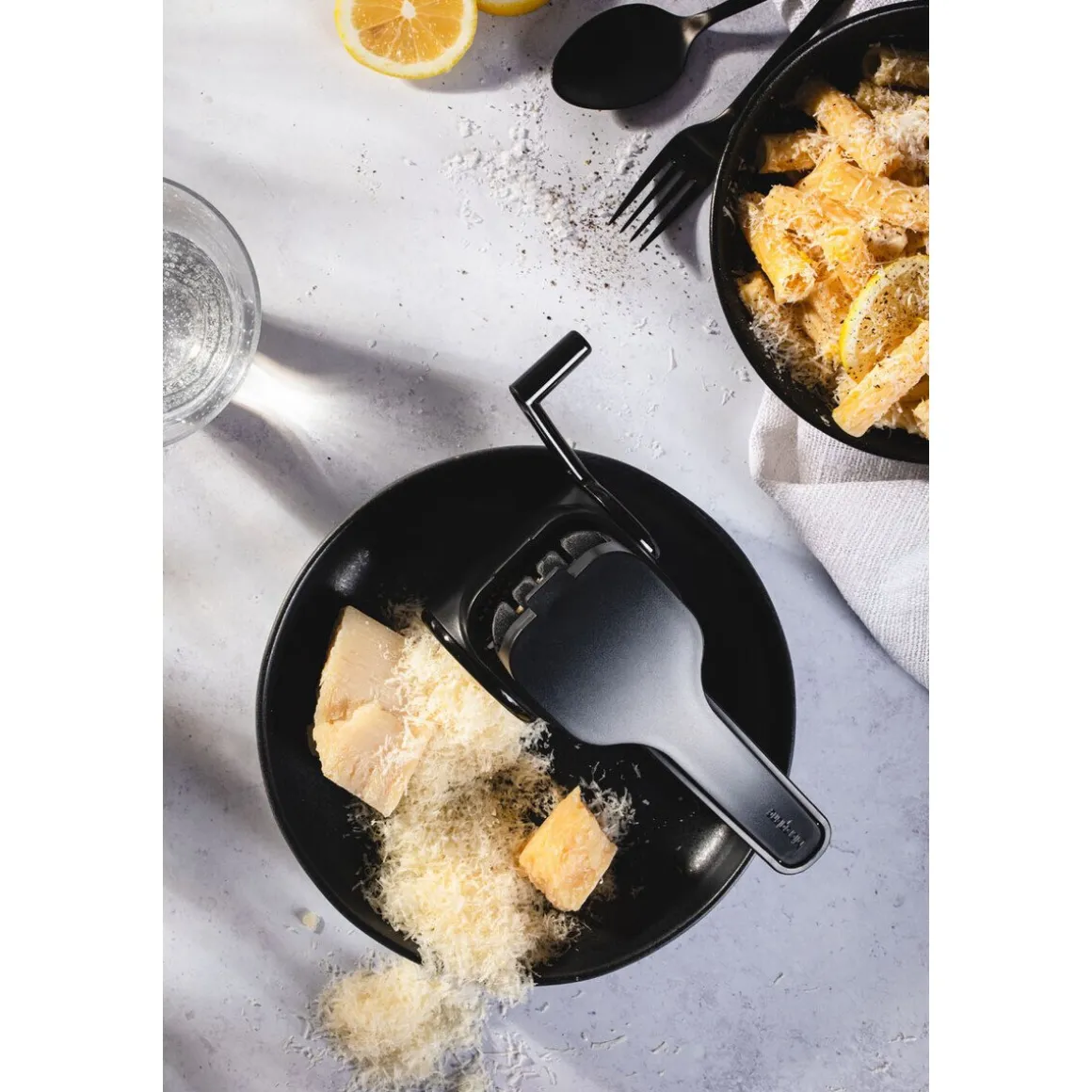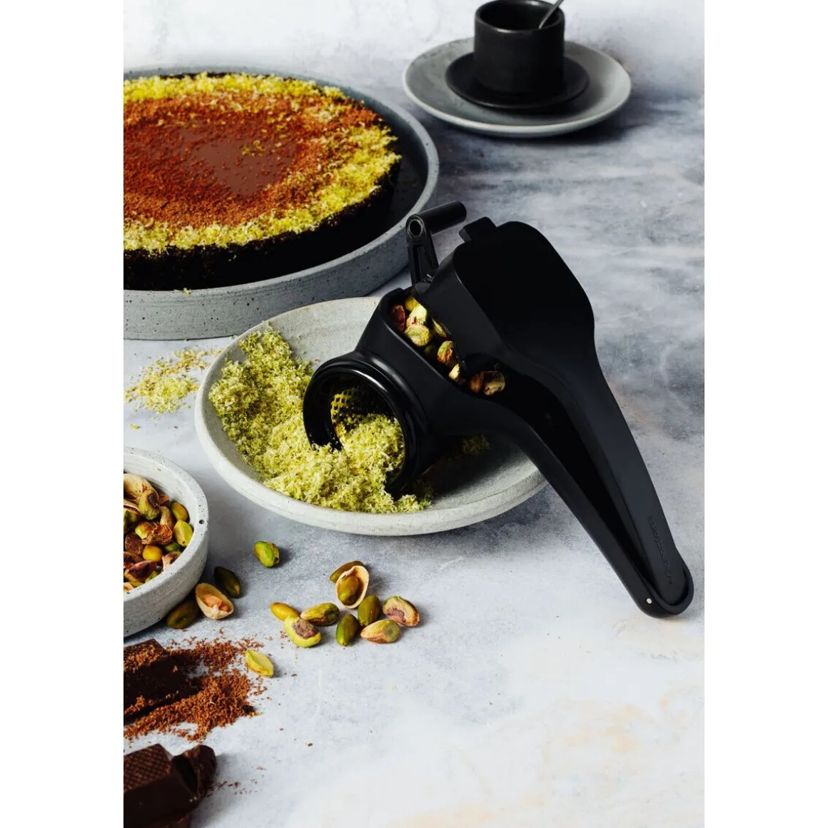 Die Rotierende Reibe der Speciality-Serie von liegt gut in der Hand und macht das Zerkleinern von Hartkäse, Karotten und Nüssen im Handumdrehen möglich. Einfach befüllen, die Reibe mit leichtem Druck auf den Griff über den Topf oder eine Schüssel halten und an der Kurbel drehen, schon rieselt die Zutat in geriebener Form in Ihr Gefäß.