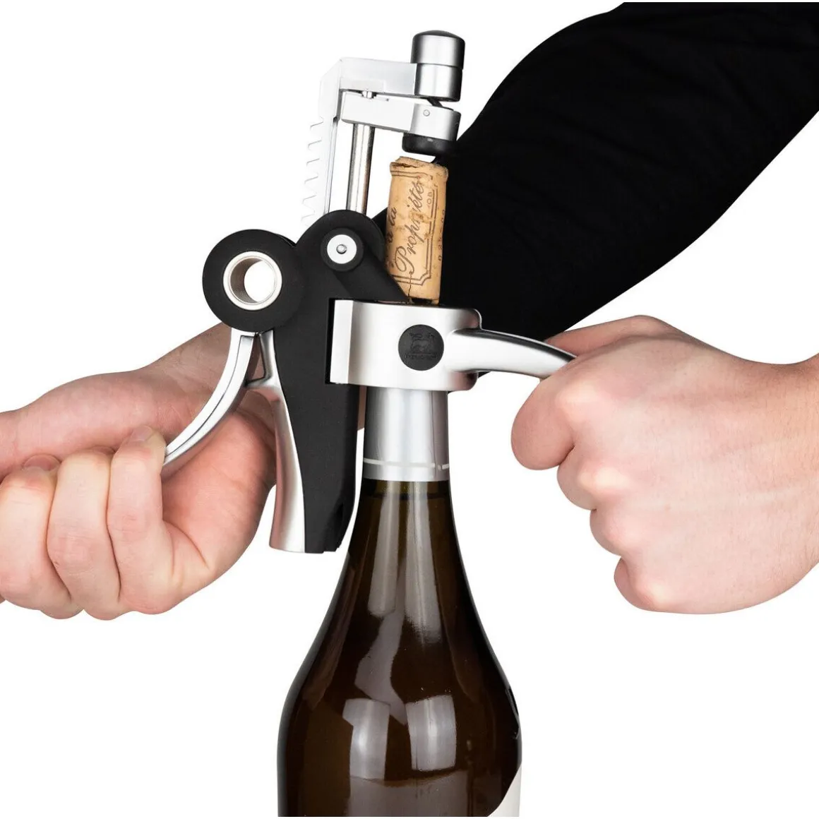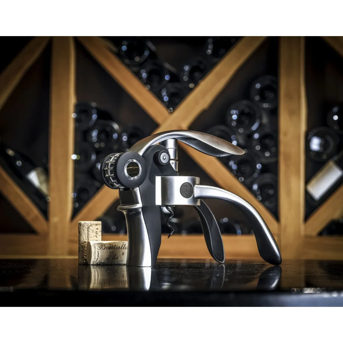 Mit dem Hebelkorkenzieher Baltaz von lassen sich Flaschen durch Ästhetik und Effizienz von ihrem Korken befreien. Die Griffe halten die Flasche fest, um ein kräfteschonendes Korkenziehen zu ermöglichen.