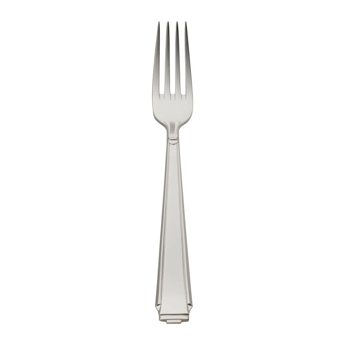 Auf einer festlichen Tafel darf die elegante Menügabel Art Deco des Herstellers Robbe & Berking nicht fehlen. Die Gabel überzeugt mit einem schlichten und wohlgeformten geometrischen Design. Somit harmoniert sie ausgezeichnet mit dem Tafelgeschirr der Serie. Mit einer Länge von 19,6 cm und einer Breite von 2,5 cm ist sie besonders praktisch und handlich. Die edle Menügabel besteht aus 925 g Sterlingsilber, ist geprägt und glänzend poliert. Außerdem ist sie robust und spülmaschinenfest. Für das Modell Art Deco gibt es eine Nachkaufgarantie bis 2040.