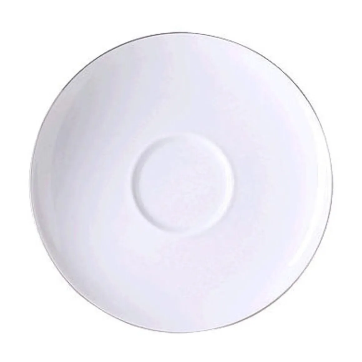 Die Teeuntertasse der Geschirrserie TAC Platin von erscheint dezent und schlicht. Die Formsprache ist eindeutig und wird von klaren Linien geführt. Einen sauberen Abschluss erhält die Untertasse durch die feine Platinkontur, die sich elegant um das Porzellan zieht.