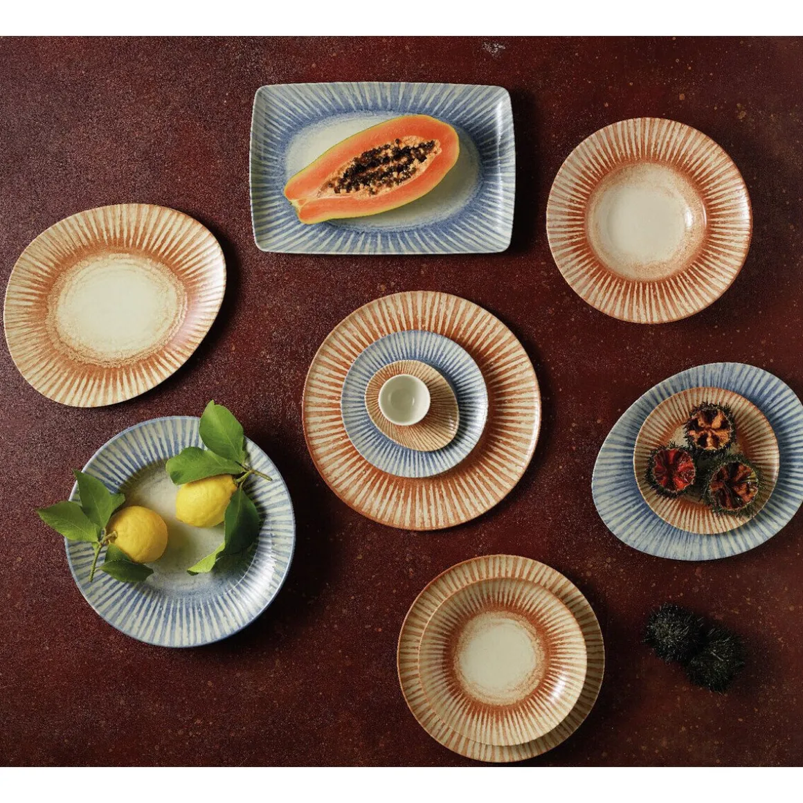 - flacher Teller Sunlight Red aus Steinzeug mit natürlichem Ausdruck