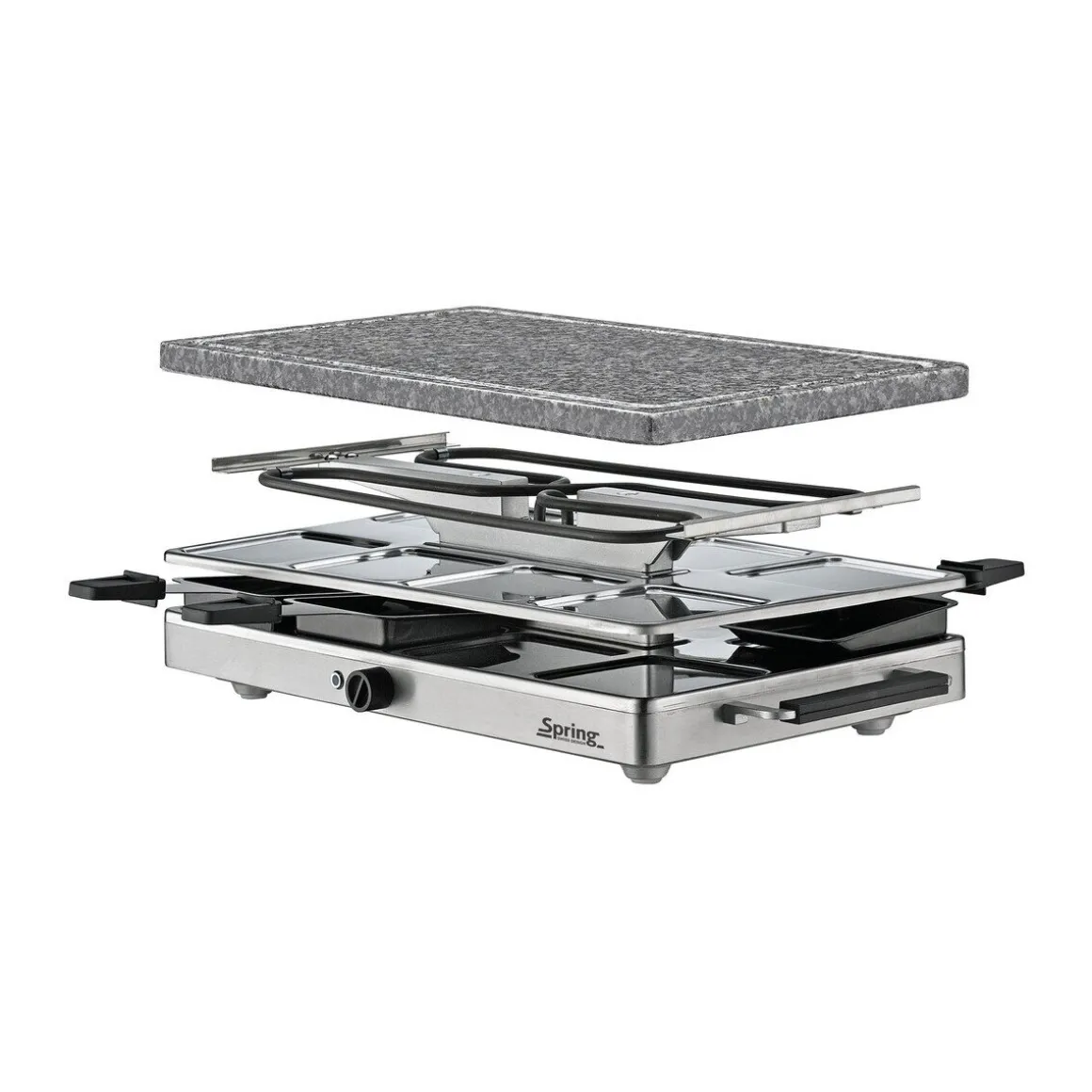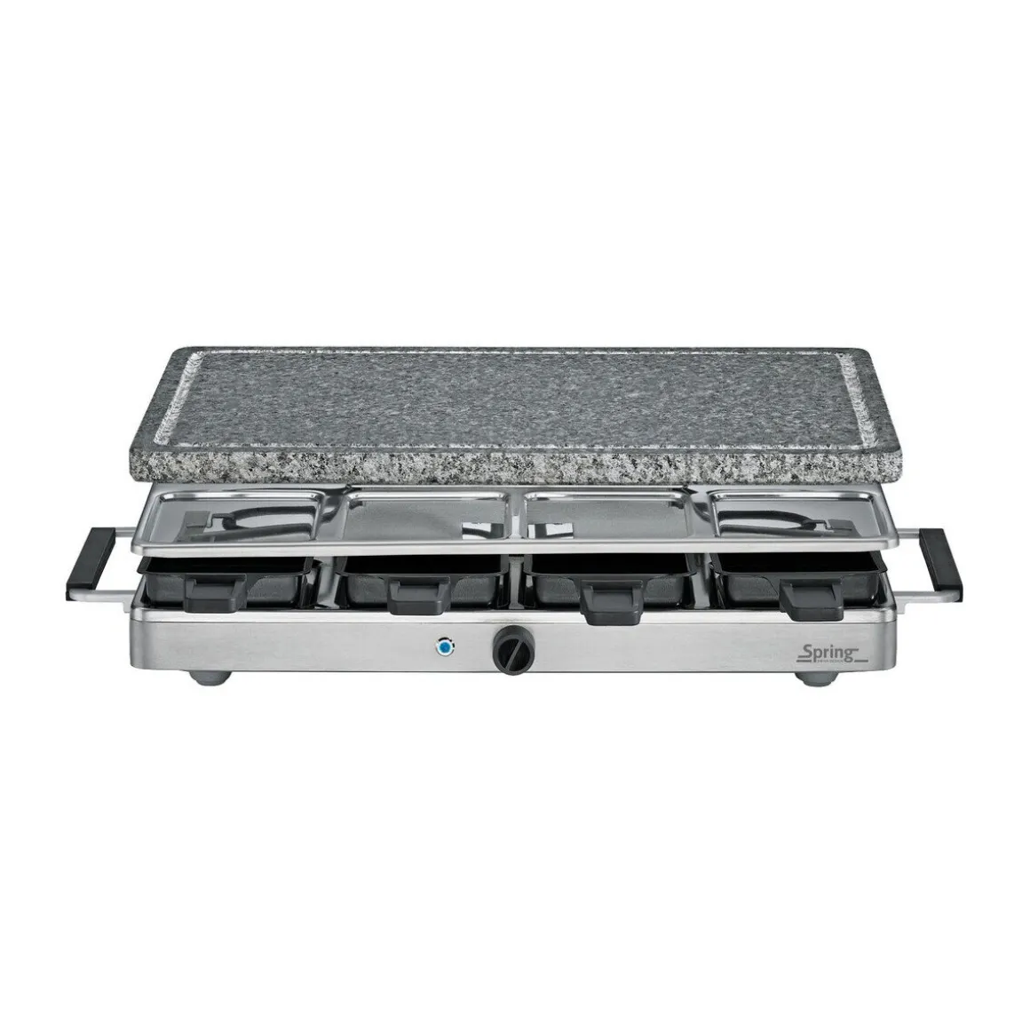 Das Raclette 8 Classic-Gerät des Herstellers macht seinem Namen alle Ehre. Auf zwei Etagen garen leckere Zutaten in Pfännchen oder auf dem Granitstein, der zur Reinigung abgenommen werden kann. Besonders Garnelen, Fleisch, Gemüse und Brot werden auf dem Grillstein zubereitet.