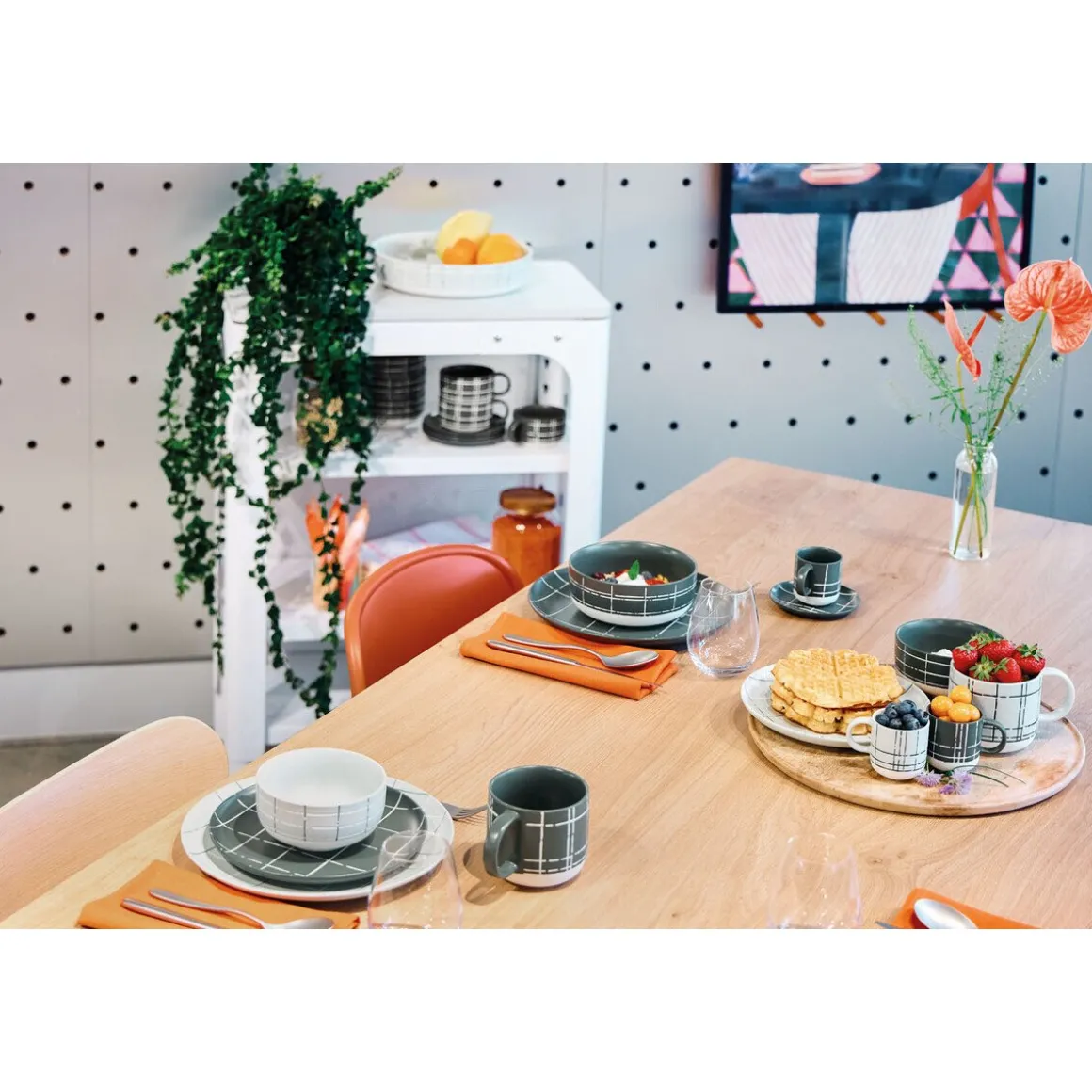 Mit dem Henkelbecher Fun Karo dark von kommt Leben auf den Tisch. Die strukturierte Karo-Musterung wirkt durch ihre dünneren und dickeren Teile wie ein Relief, das durch einen Pinsel aufgetragen wurde und sorgt für einen verführerischen Handmade-Charakter. Mit diesem Geschirrstück lassen sich kreative Tischbilder zaubern, die vor Individualität nur so strotzen. Probieren Sie es aus.