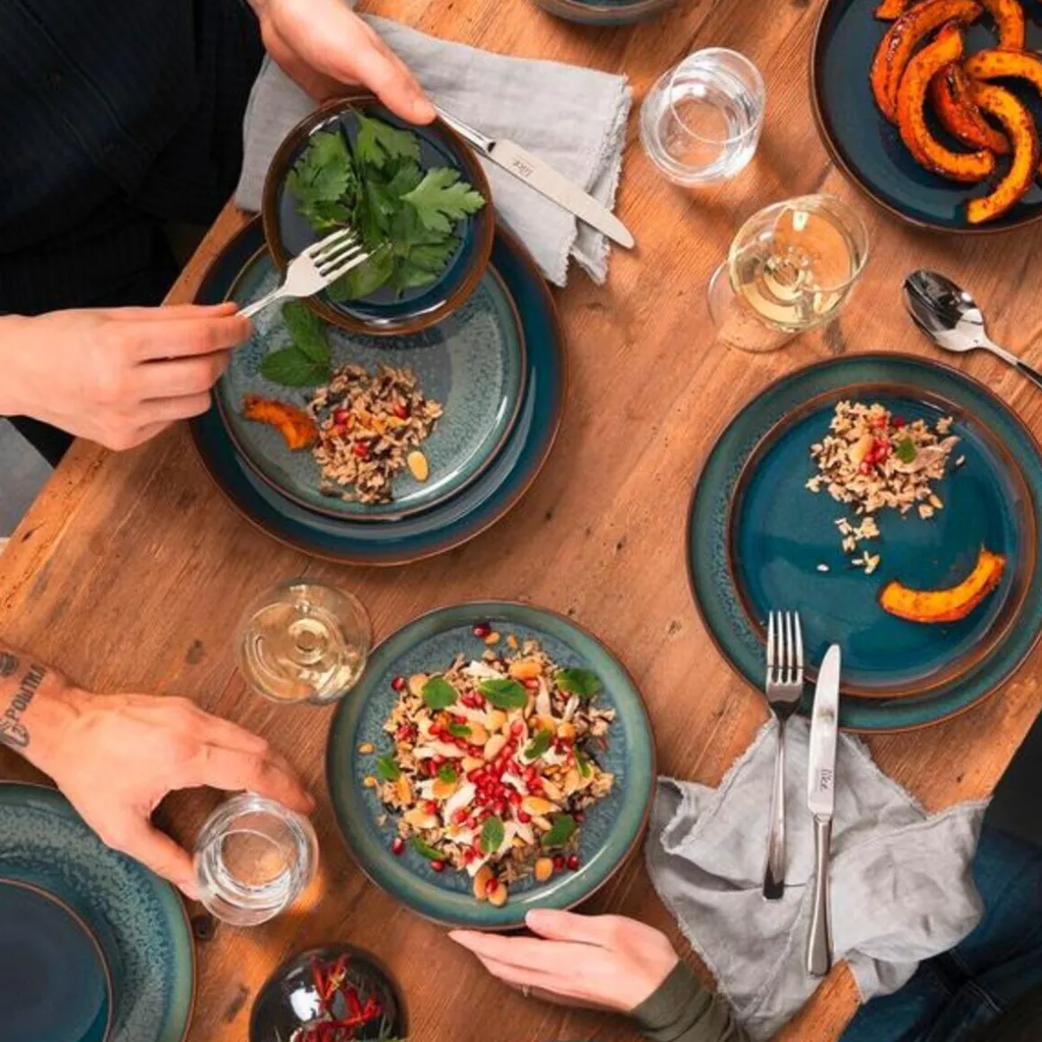 Die Serie Crafted von steht für angesagte Food-Stylings und trendige Tischarrangements. Eine spezielle Reaktiv-Glasur ist der Grund, weshalb jede Tasse, jeder Teller und jede Schale ein wenig anders aussehen. Sie unterstreicht den modernen und frischen Töpfer-Look. Die beiden Farbtöne Breeze, ein verwaschenes Jeans-Blau, und Denim, ein intensives Grau-Grün, werden durch einen kräftigen Töpfer-Braunton eingerahmt. Jede Farbe für sich wirkt trendbewusst und mediterran. Für Abwechslung auf dem Tisch lassen sich beide Farben nach Herzenslust mixen und matchen – dank den vielfältigen Kombinationsmöglichkeiten kommt garantiert keine Langeweile auf.