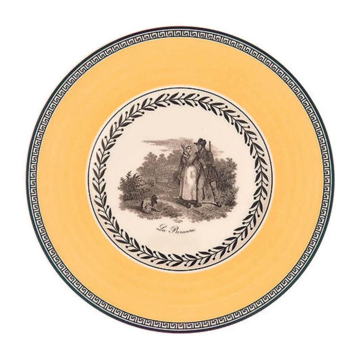 Der Brotteller Audun Chasse von begeistert durch seine warme und historische Ausstrahlung. Das Zentrum des Tellers ist von einer Jagdszene im Kupferstichstil der 1830er-Jahre geprägt und wird von einer breiten Bordüre mit gelbem Farbwascheffekt umspielt. Kredenzen Sie Baguette oder Bruschetta auf diesem blickfangenden Teller.