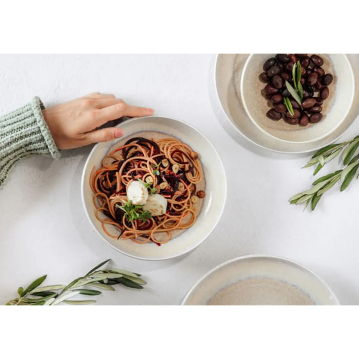 Das Tafel-Set Perlemor Sand von bringt den Pottery-Charme auf Ihre Candle-Light-Tafel. Sanfte Farbnuancen und variierende Schattierungen ziehen sich über den Speiseteller sowie die Pastaschale und zeugen von der Vielfalt der Farbtöne an natürlichen Sandstränden. Holen Sie sich mit diesem Set einen Hauch an Leichtigkeit und wohltuende Summer Vibes in Ihr Zuhause.