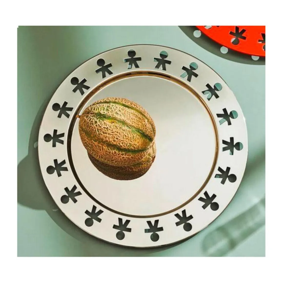Kleine Strichmännchen und -frauen sind charakteristisch für die Kollektion Girotondo von . Sie zieren Platten, Schalen, Dosen, Serviettenringe und viele weitere Küchen- und Tischaccessoires. Sie tragen die unverwechselbare Handschrift der beiden Designer Stefano Giovannoni und Guido Venturini, die zusammen das Design-Duo King-Kong ergeben. Ihre Produkte sind fest mit der italienischen Designschmiede Alessi verschmolzen. Die runde Platte Girotondo ist ein sehr schönes Stück, um darauf Gästen süßes oder salziges Gebäck anzubieten. Die Speisen werden auf der glänzend polierten Fläche angerichtet und von dem umlaufenden Dekor begleitet.