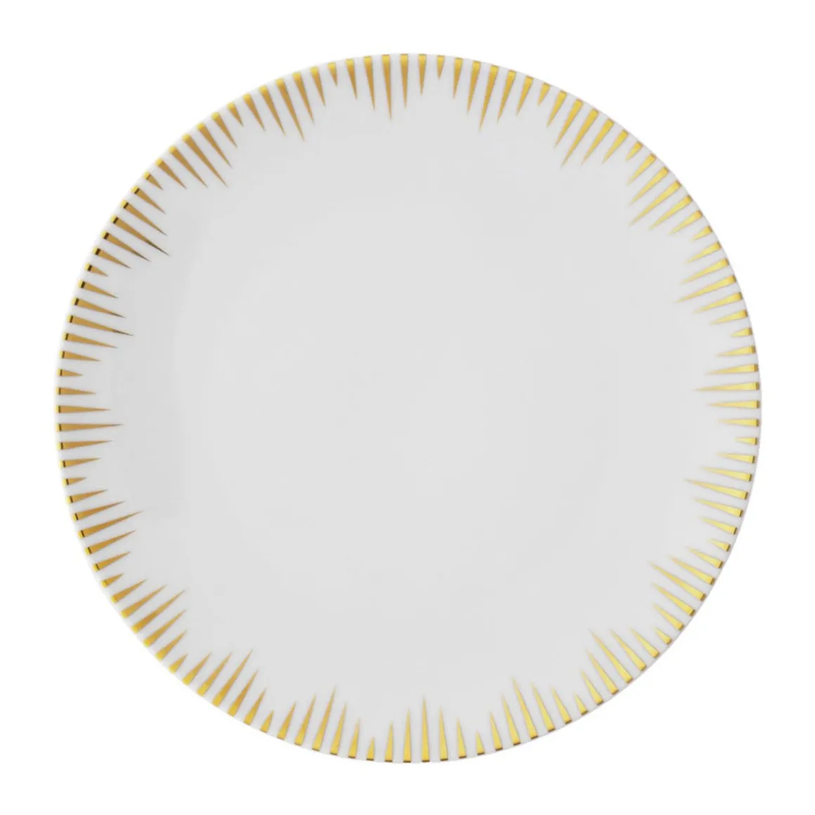 Mit dem Frühstücksteller TAC Festive Celebration von wird der Genuss von Croissants und Brötchen von einem glänzenden Dekor begleitet. Filigrane Linien in Gold ziehen sich vom Tellerrand in unterschiedlicher Länge Richtung Mitte und lassen eine sternähnliche Musterung entstehen.