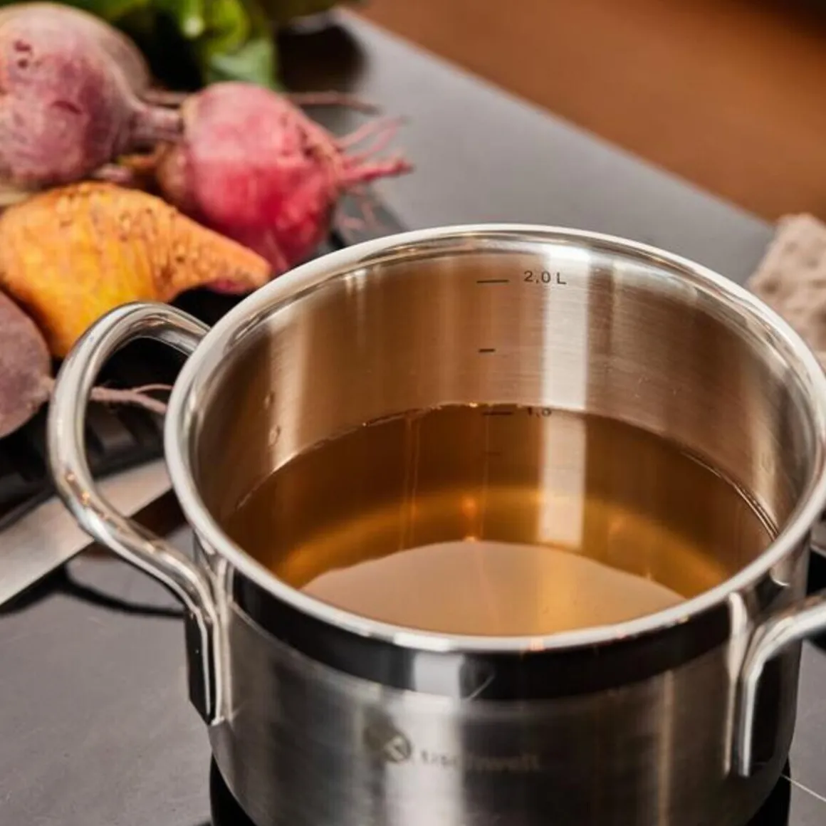 - gefertigt aus zwei Schichten induktivem Edelstahl, die sich um einen dreifachen Aluminiumkern legen